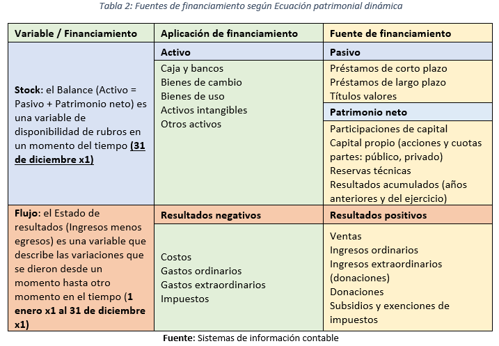 Esta aproximación establece una base de aglomeración del concepto de Fuente de financiamiento del lado derecho de la Ecuación patrimonial dinámica; donde podemos encontrar en primer lugar en el rubro de cuentas que describen los valores Reembolsables: estos pueden ser deudas laborales, tributarias, préstamos e instrumentos del mercado de valores (públicos, privados, de corto, mediano y largo plazo); en segundo lugar, los aportes de capital expresados en acciones o cuotas partes de una empresa, proyecto o iniciativa (i.e. estas participaciones pueden ser públicas, privadas, nacionales e internacionales), en este segundo subgrupo de fuentes de financiamiento se incluye los resultados acumulados de una institución (i.e. resultados de años anteriores o resultados del ejercicio); como tercer subgrupo de fuente de financiamiento están los Resultados positivos: ventas, otros ingresos ordinarios y extraordinarios, donaciones, subsidios y/o exenciones de impuestos, entre otros posibles.