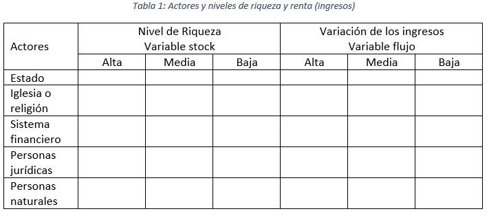 A su vez cada actor dependiendo del nivel de riqueza disponible o renta a la cual accede en cada periodo de tiempo, pueden ser clasificados en tres niveles básicos (pueden existir más): alta, media y baja.